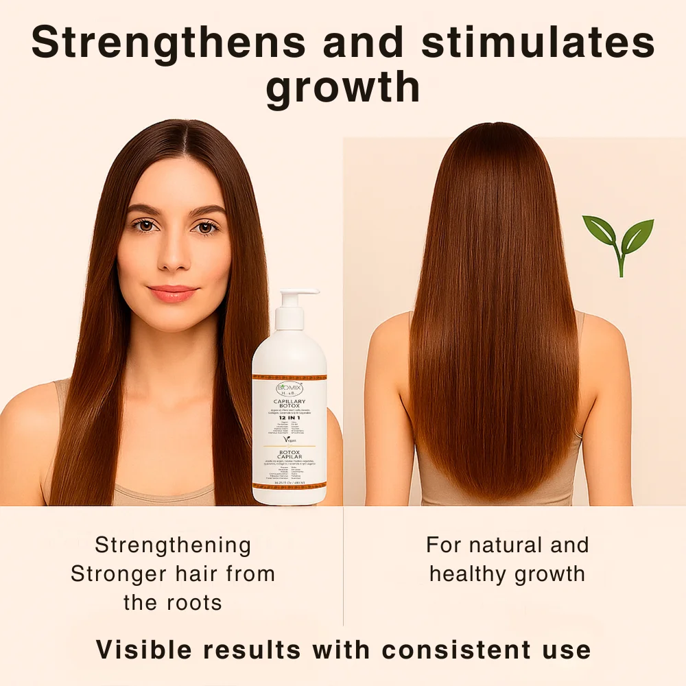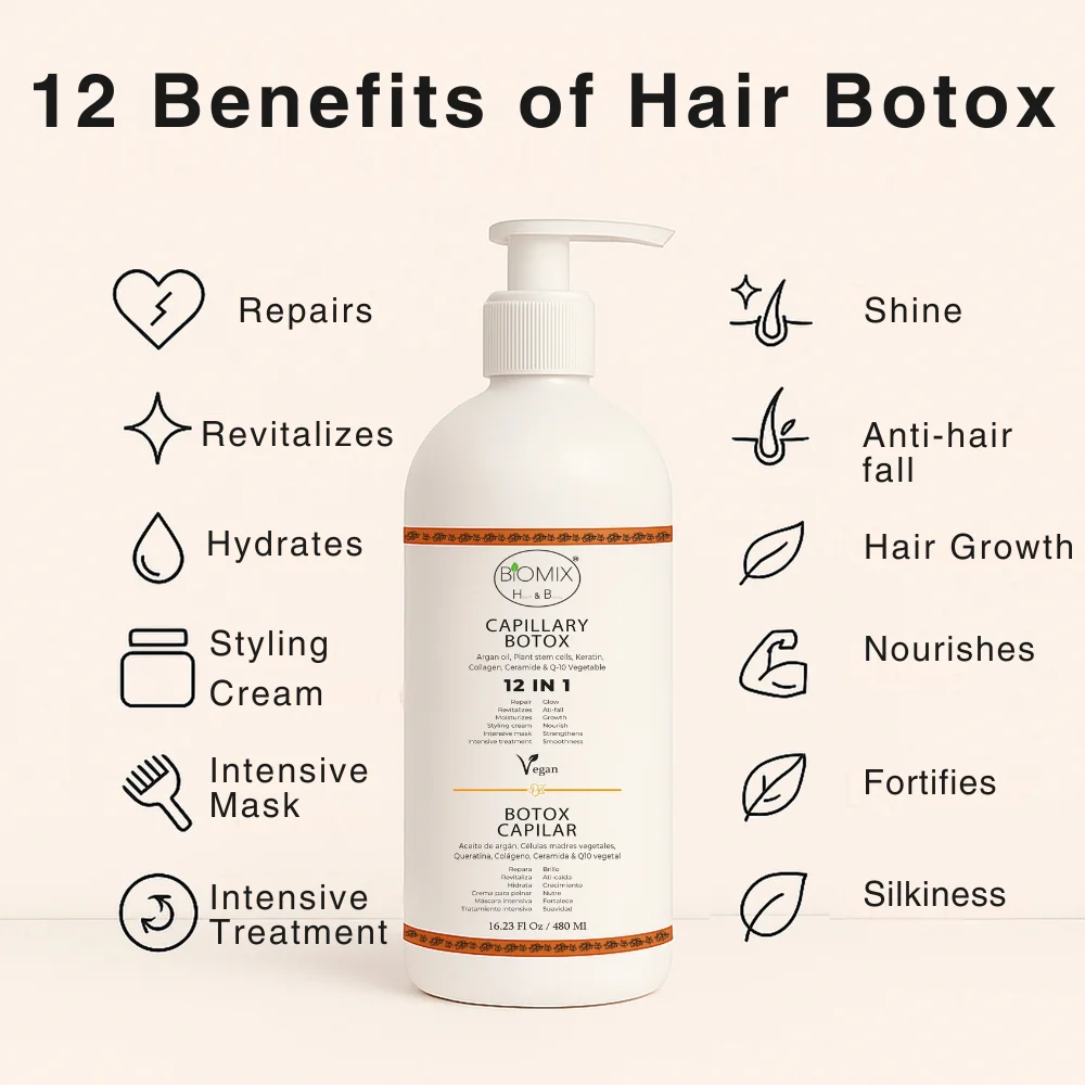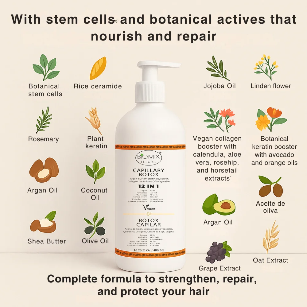 Botox Capilar Vegano Hipoalergénico Keratina, Colágeno, Aceite de Argán, Células Madres Vegetales, Vitaminas - Tratamiento Capilar 12 en 1 Intensivo 480 Ml