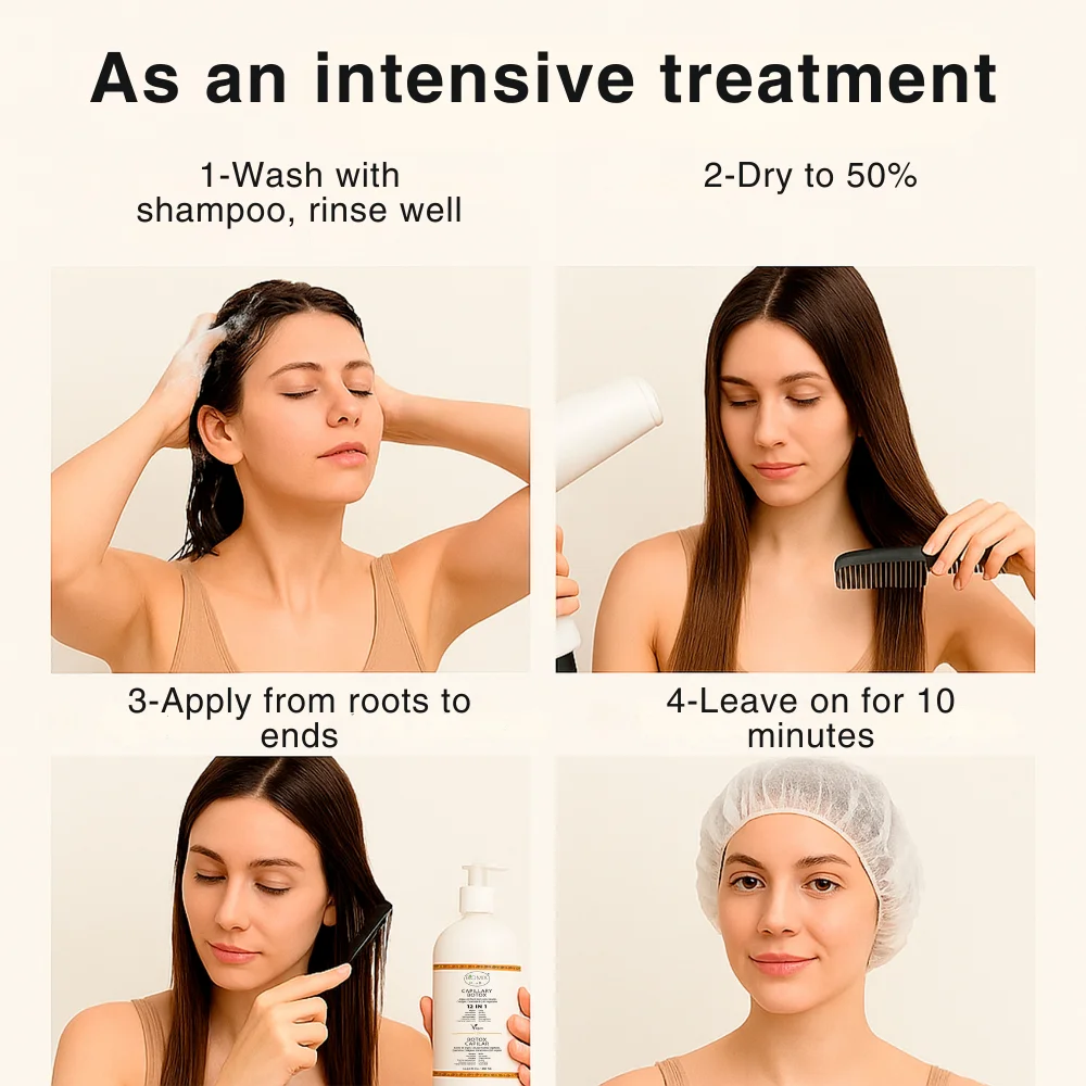 - Funciona como mascarilla, tratamiento intensivo y crema para peinar.