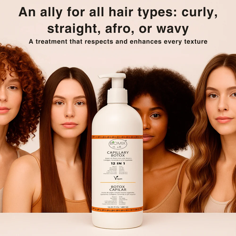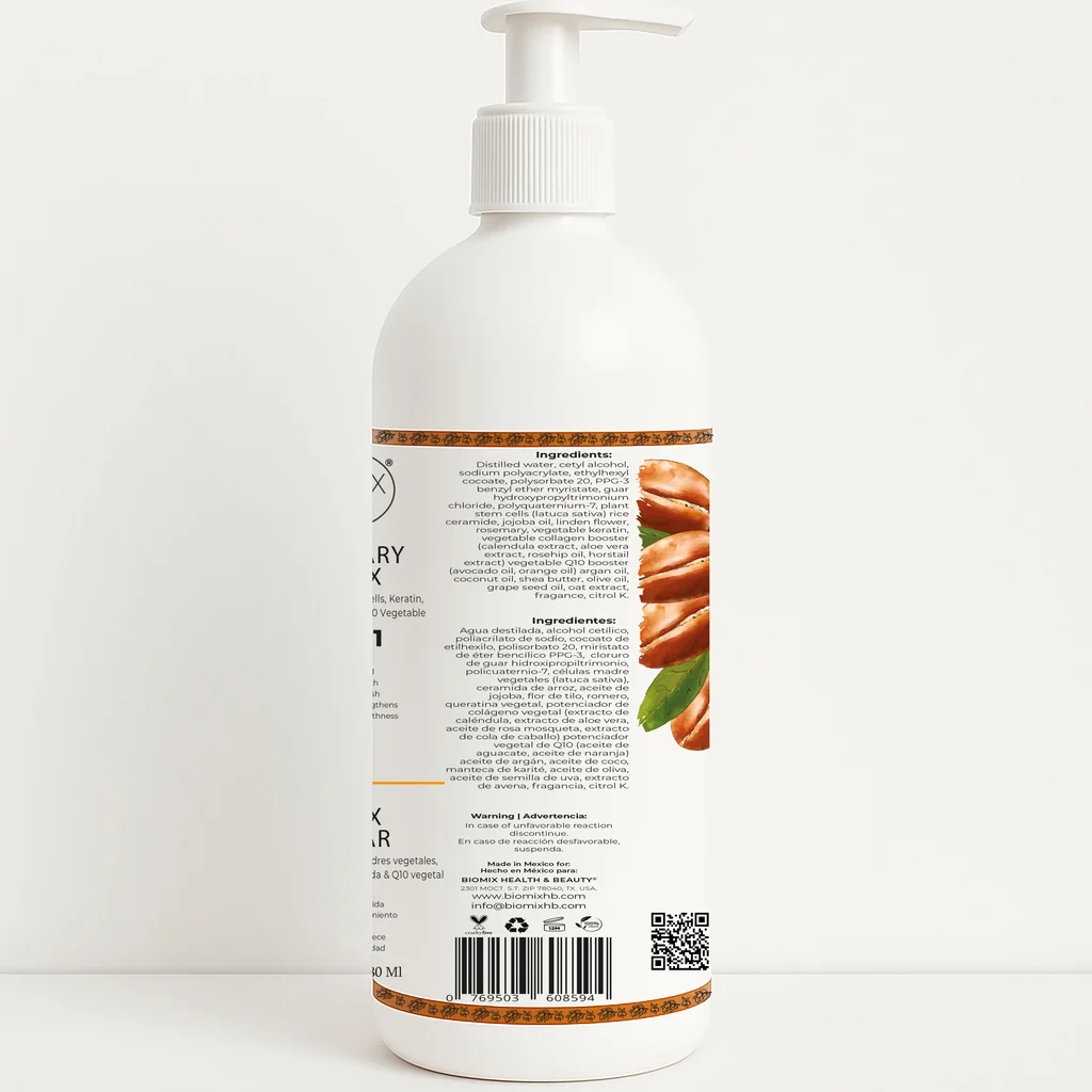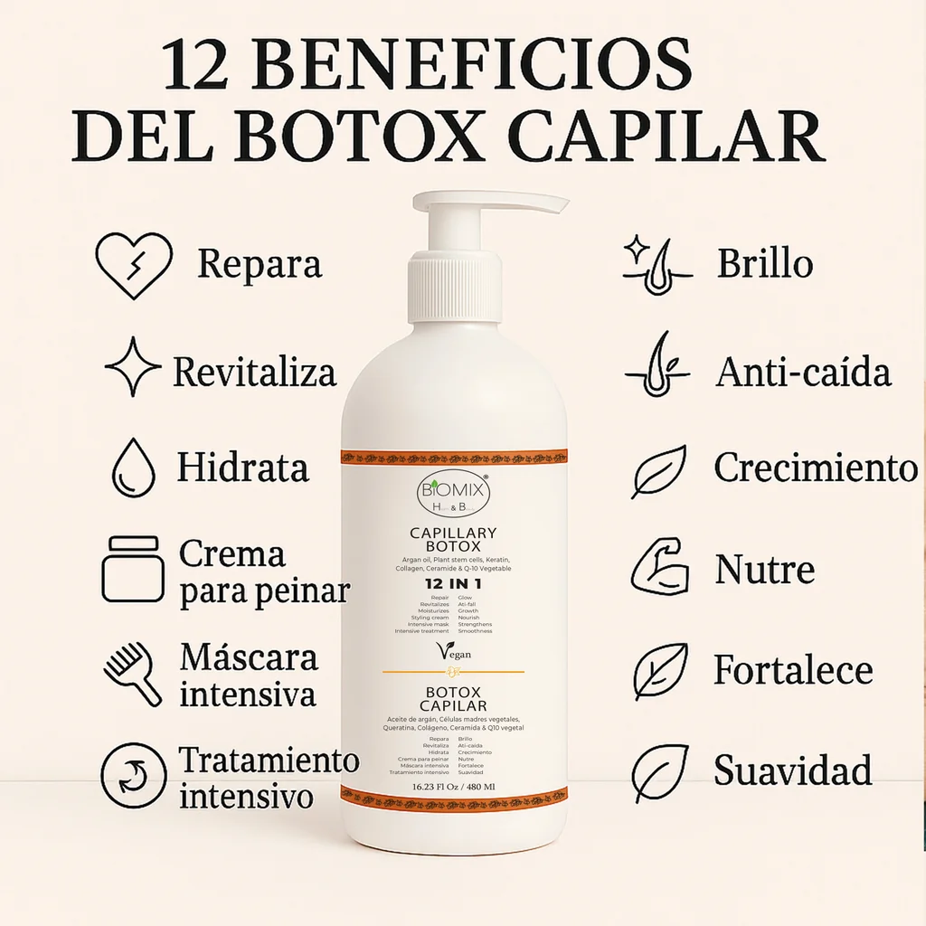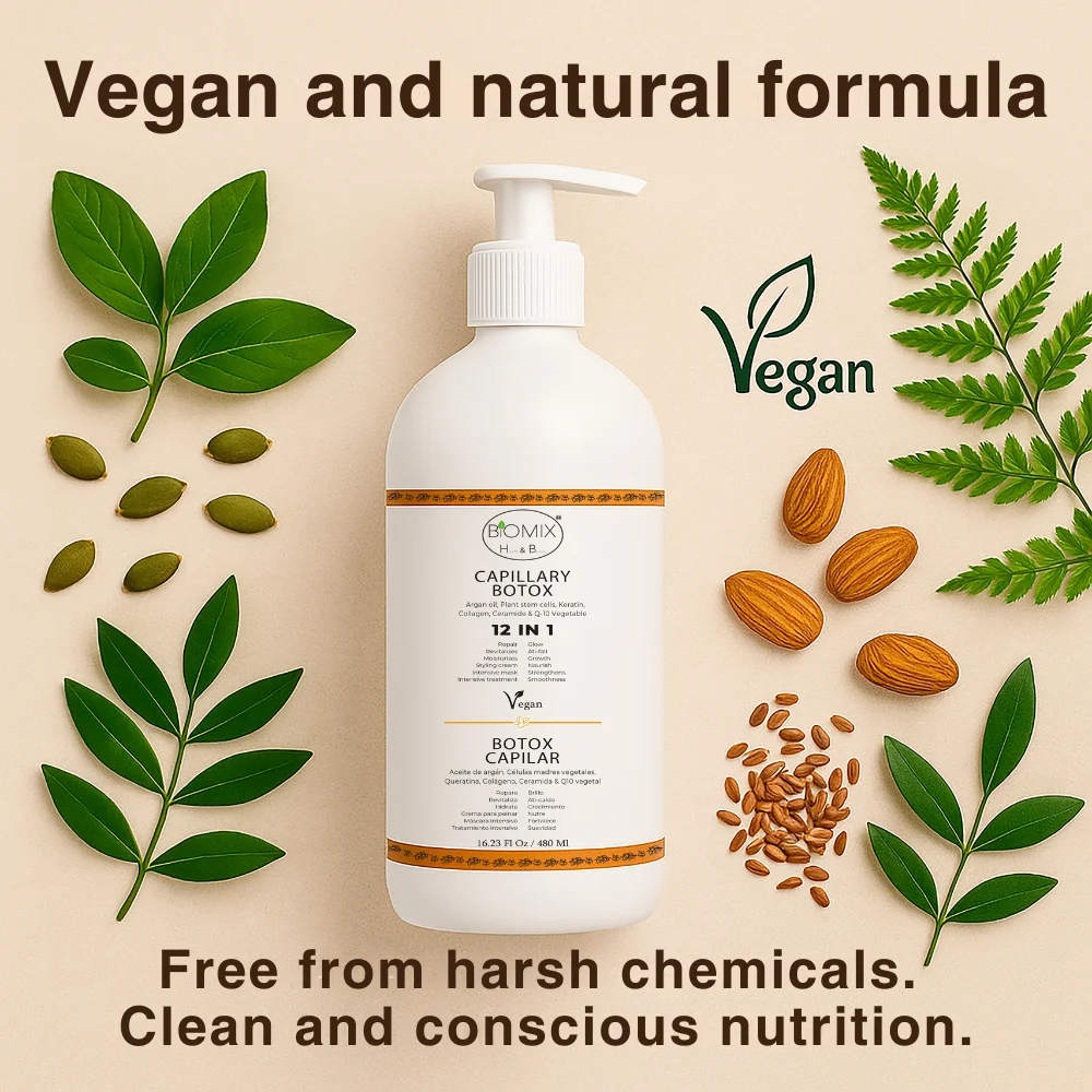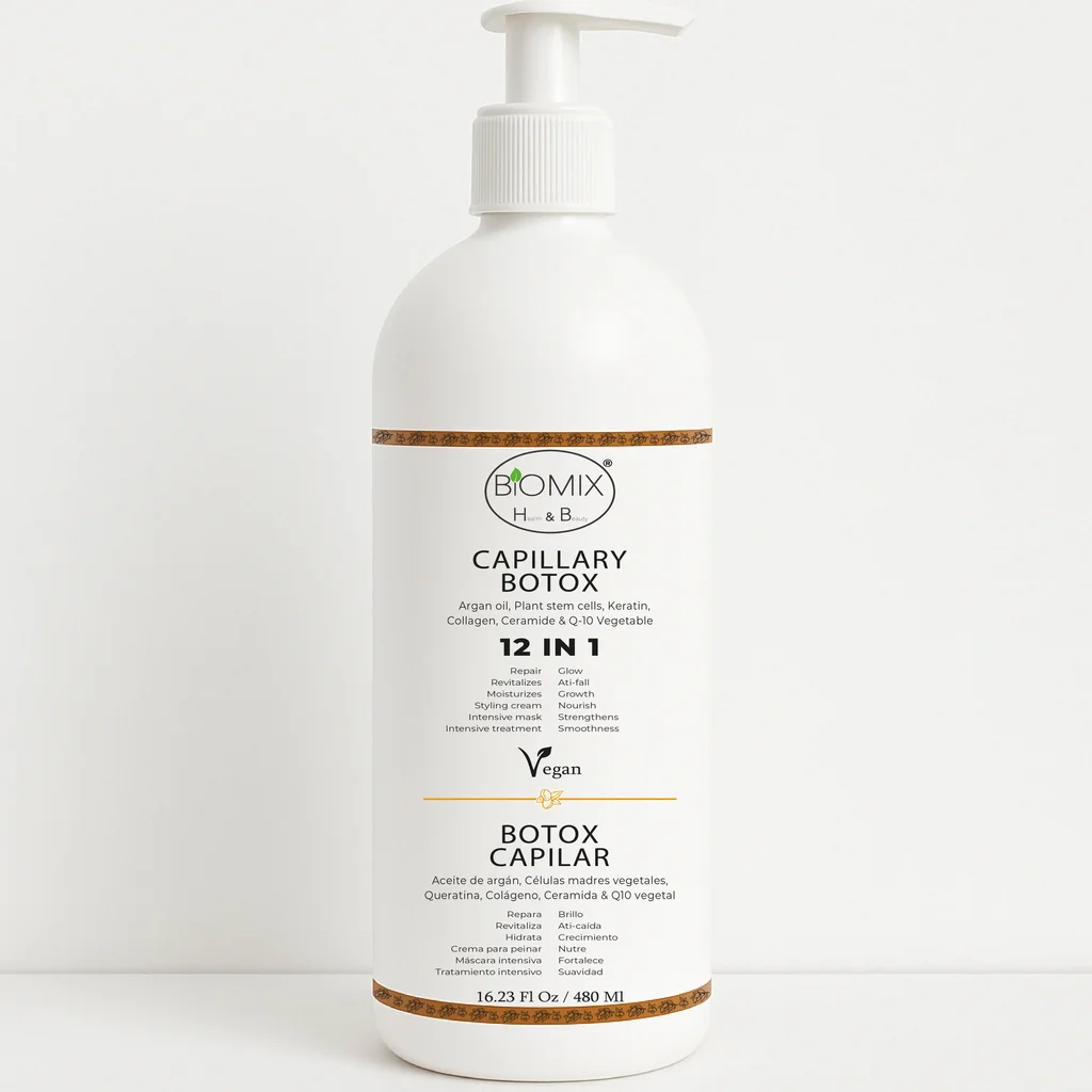 El Botox Capilar Biomix Health & Beauty es un tratamiento profesional 12 en 1, desarrollado con la más alta biotecnología vegetal para devolverle al cabello su fuerza, brillo y vitalidad natural. Su fórmula única y 100% vegana combina células madre vegetales (lattuca sativa), ceramida de arroz, queratina vegetal y un complejo de extractos y aceites botánicos, logrando una acción reparadora y protectora desde la raíz hasta las puntas.
