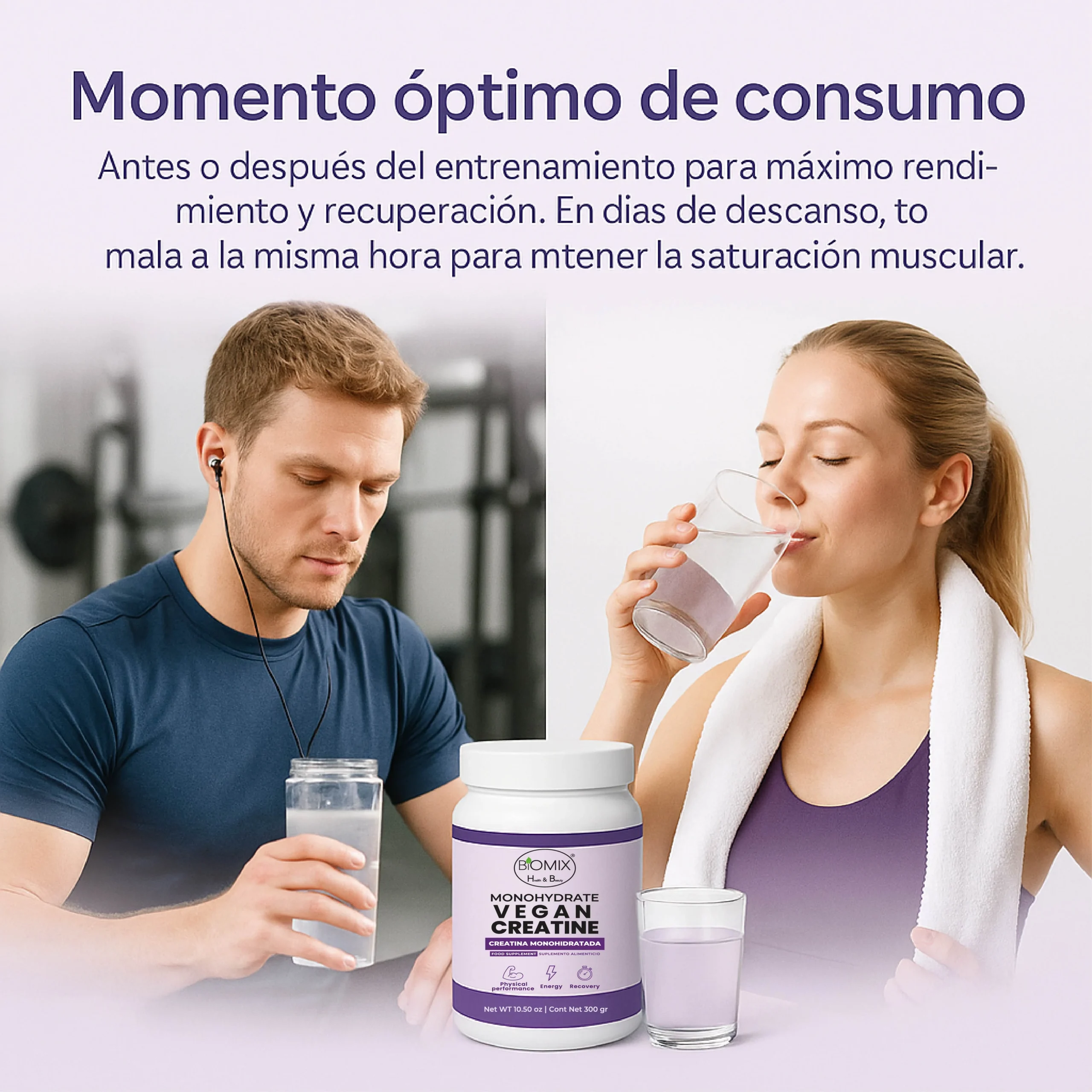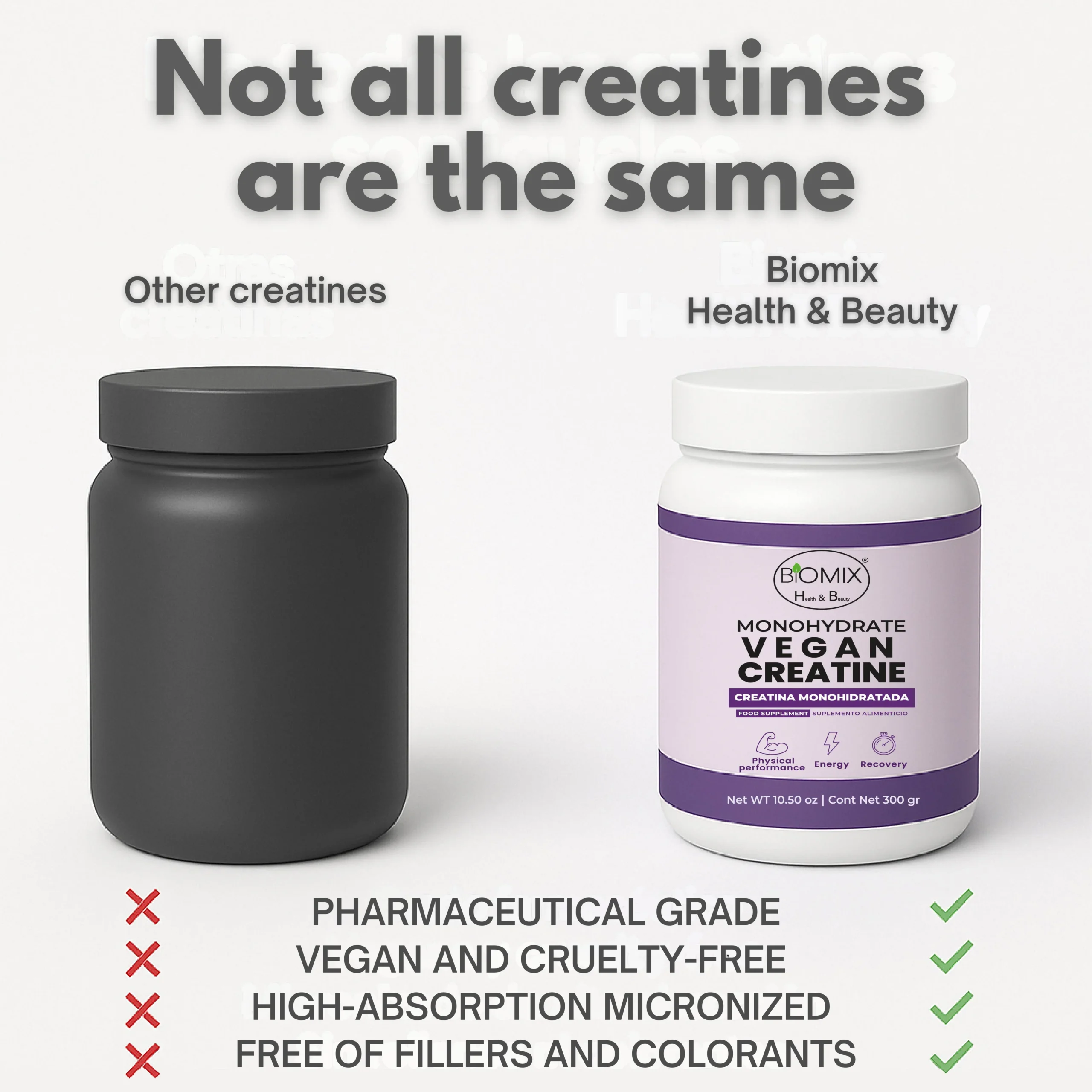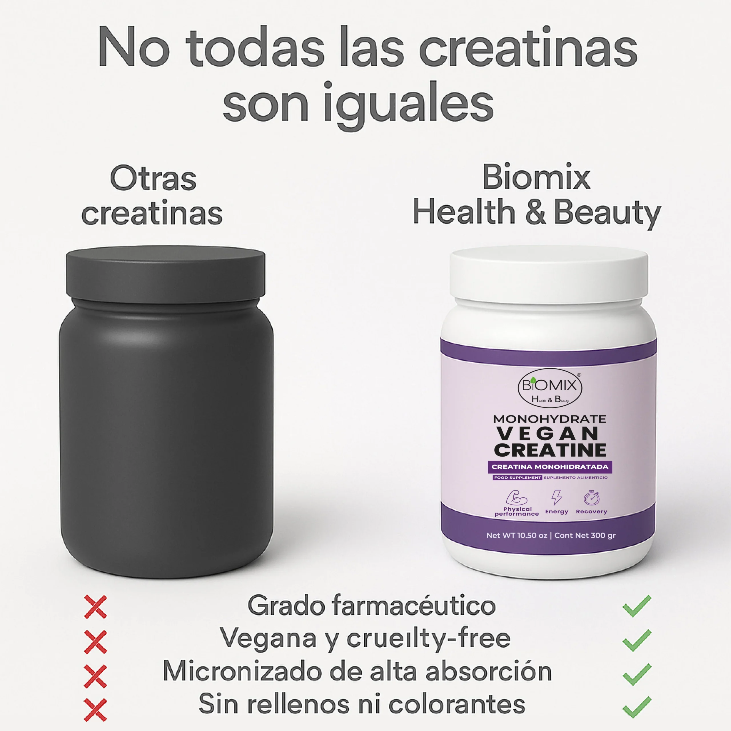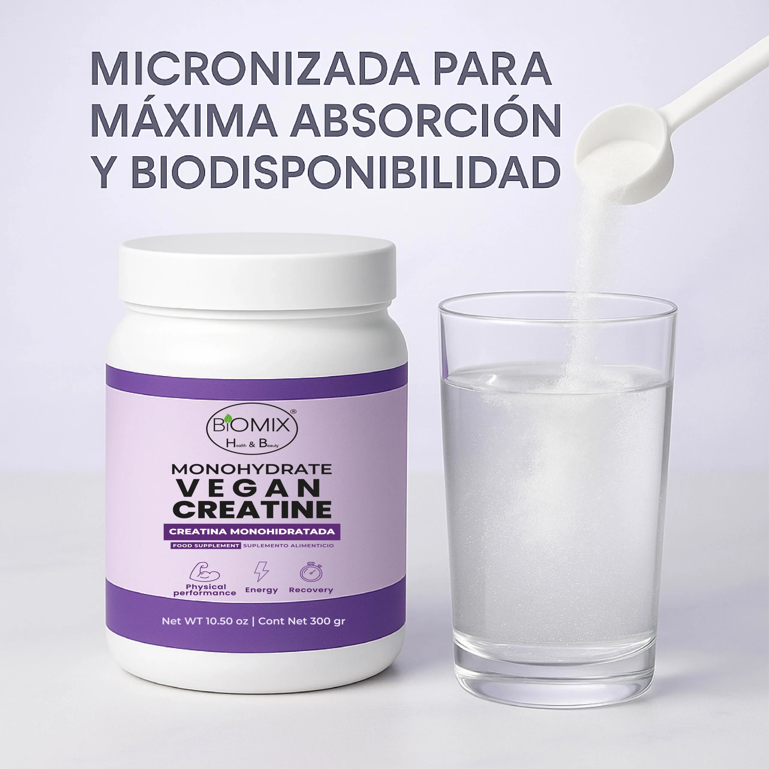 A diferencia de las creatinas convencionales, Biomix Health & Beauty utiliza un proceso de micronización ultrafina, obteniendo partículas hasta 20 veces más pequeñas, lo que permite una disolución inmediata, absorción rápida en las fibras musculares y un mejor aprovechamiento celular, con menor carga digestiva.