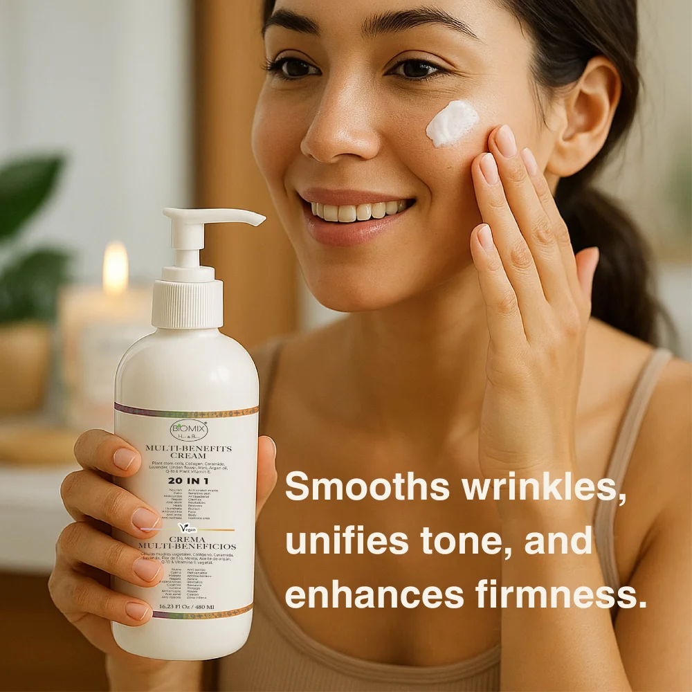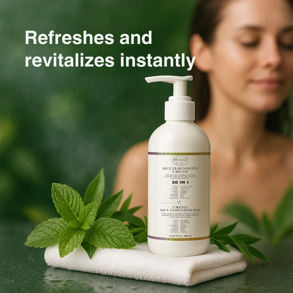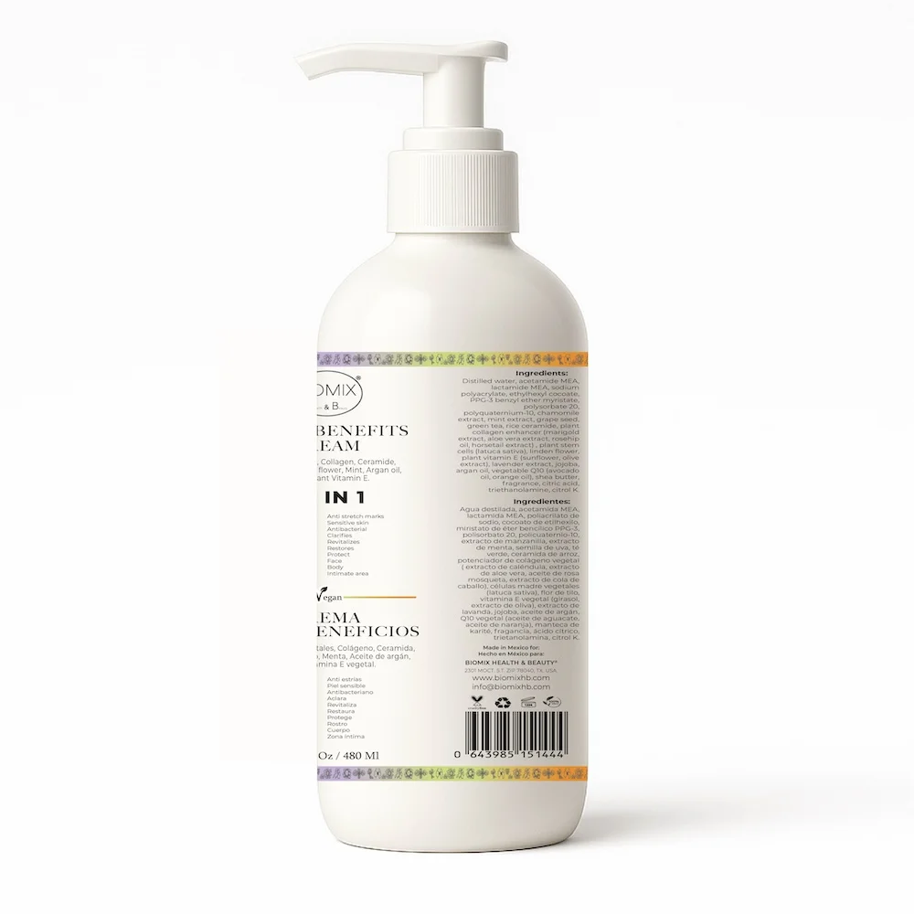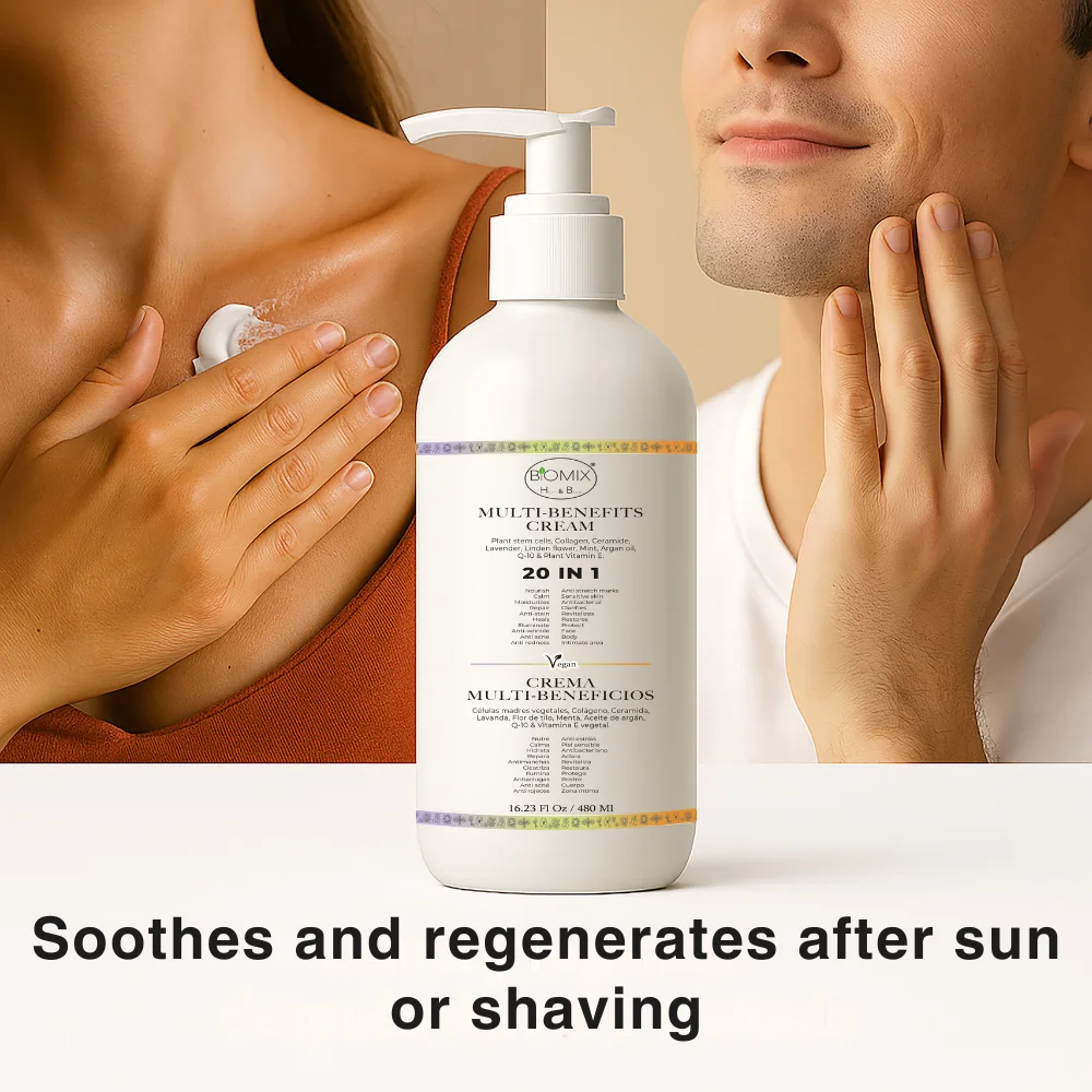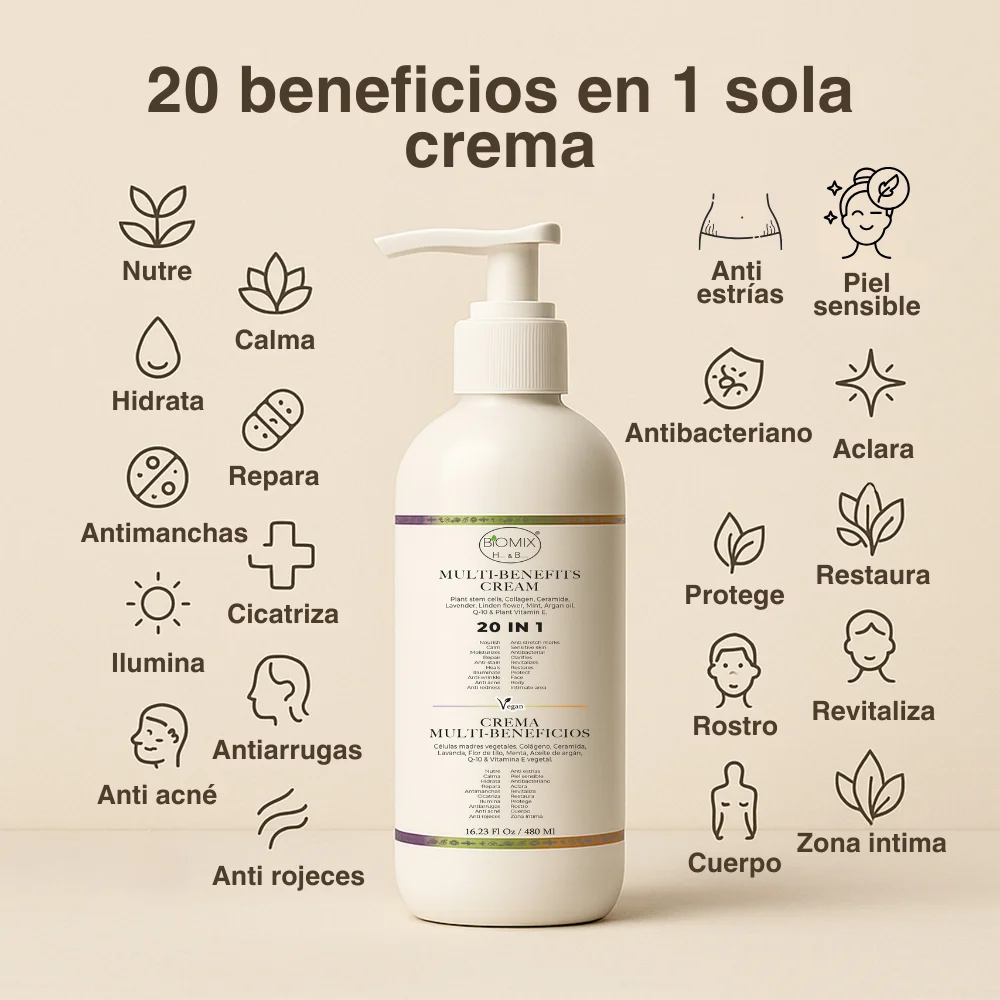 La  Crema Multibeneficios 20 en 1 Biomix (480 ml) es un tratamiento profesional y versátil, diseñado para rostro, cuerpo y zona íntima. Su fórmula vegana, natural y dermatológicamente equilibrada combina 15 ingredientes activos botánicos de alto rendimiento para ofrecerte 20 beneficios reales en una sola crema.