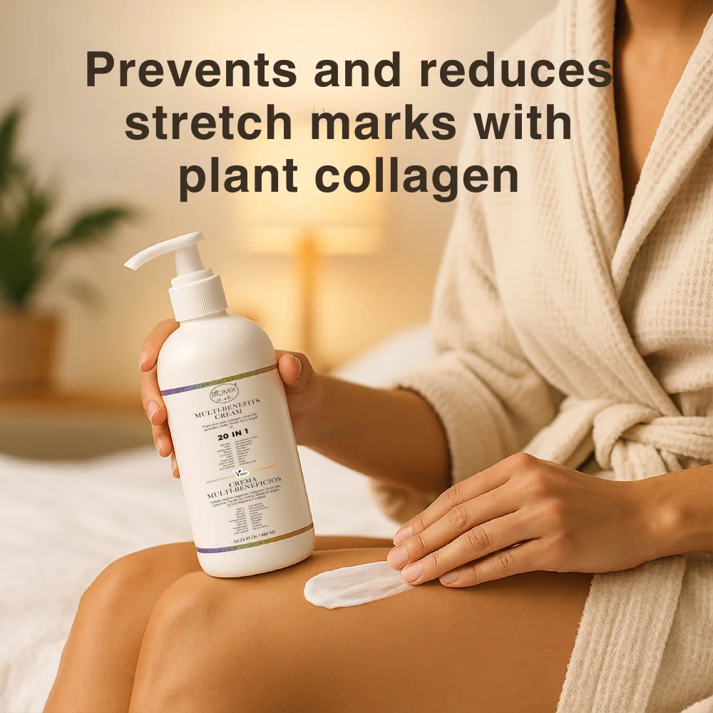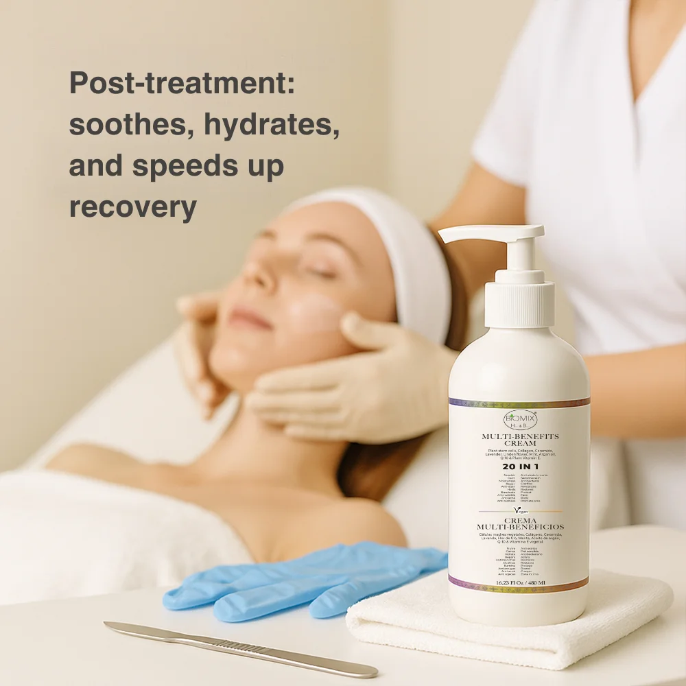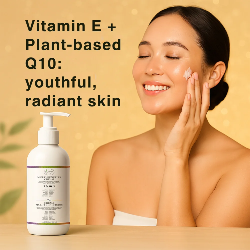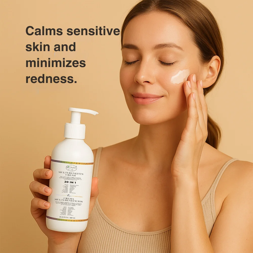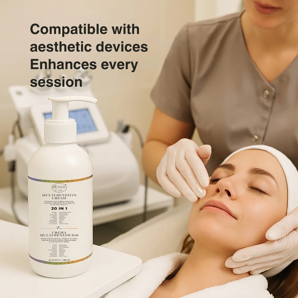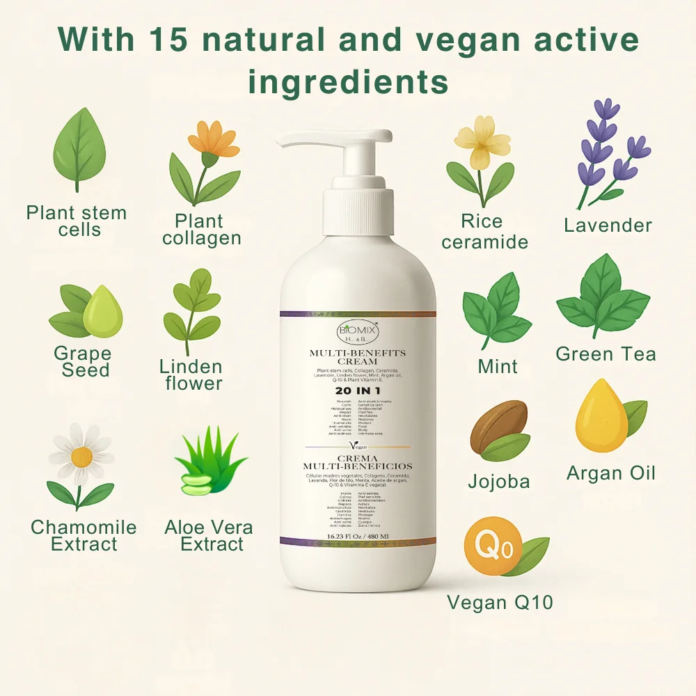 La  Crema Multibeneficios 20 en 1 Biomix (480 ml) es un tratamiento profesional y versátil, diseñado para rostro, cuerpo y zona íntima. Su fórmula vegana, natural y dermatológicamente equilibrada combina 15 ingredientes activos botánicos de alto rendimiento para ofrecerte 20 beneficios reales en una sola crema.