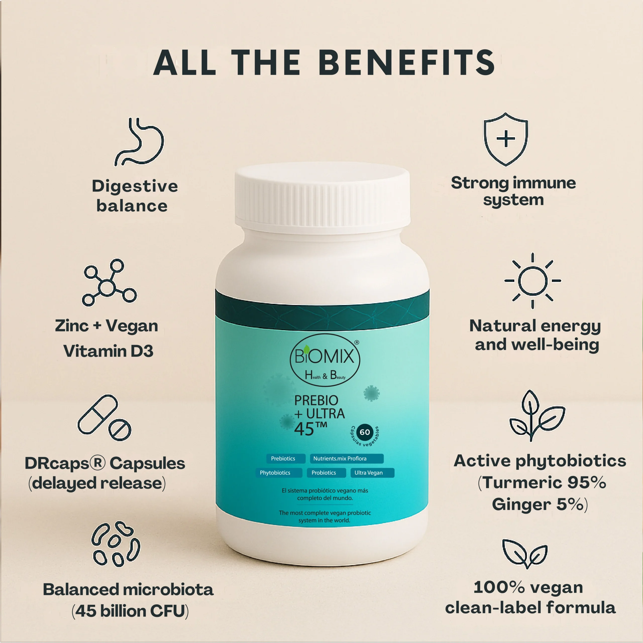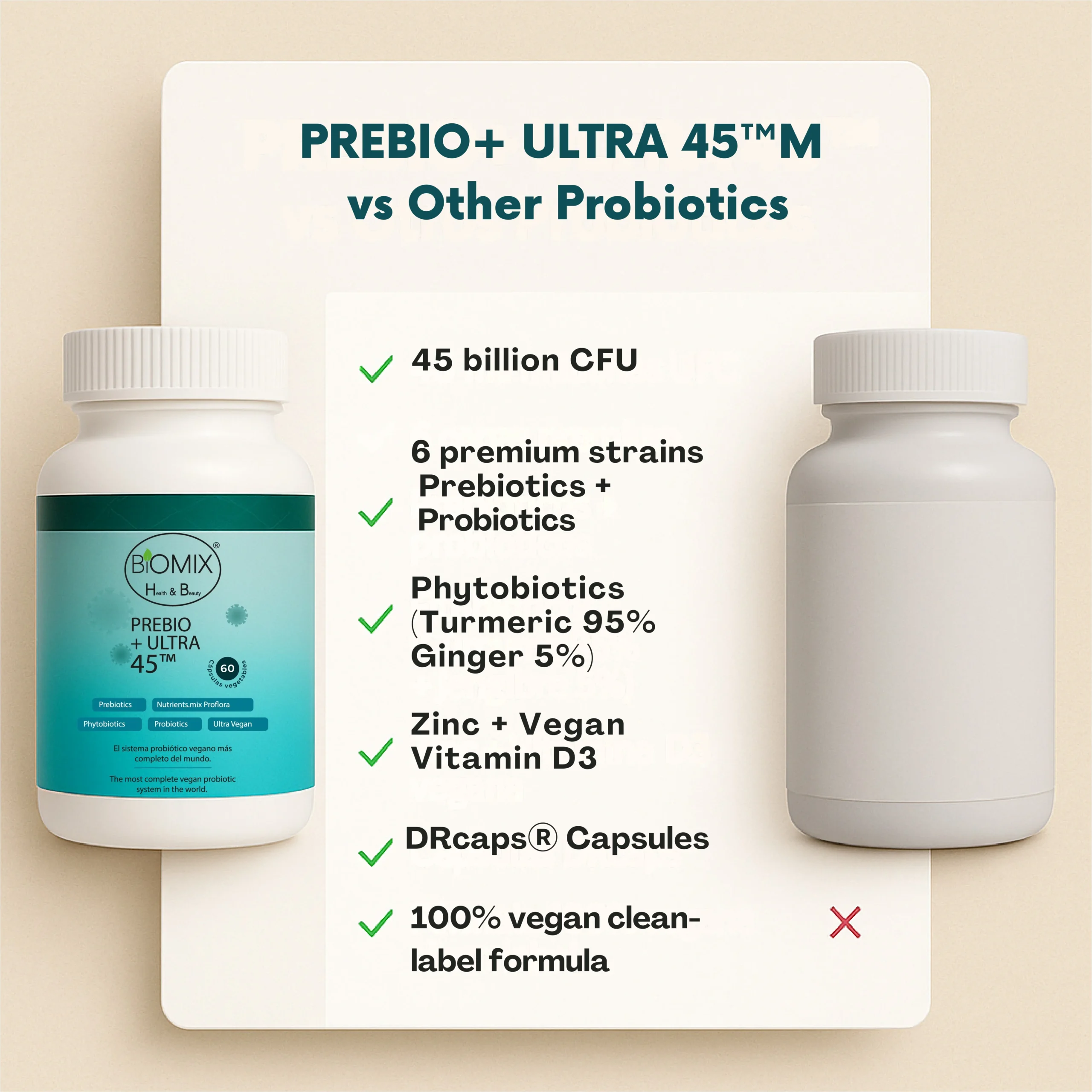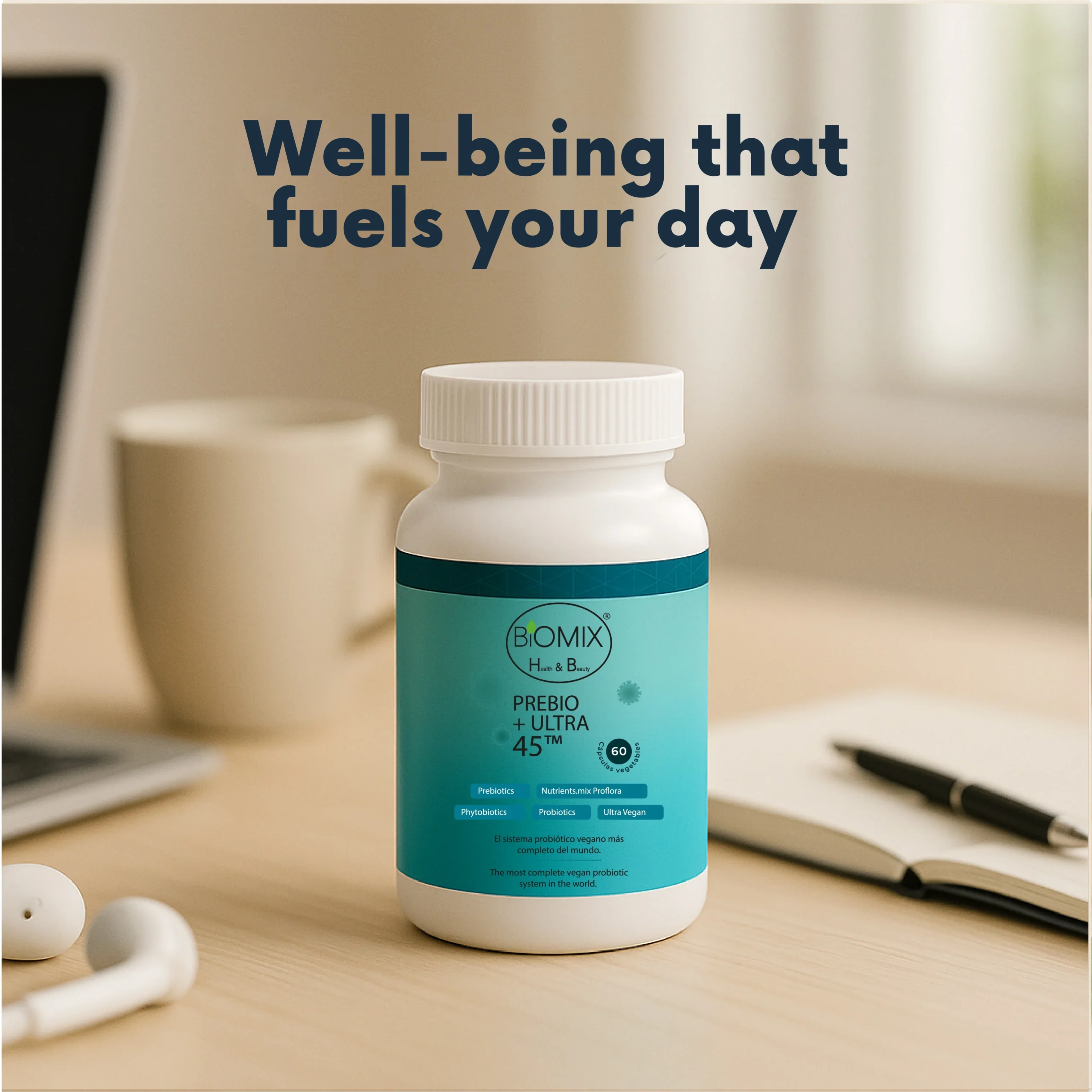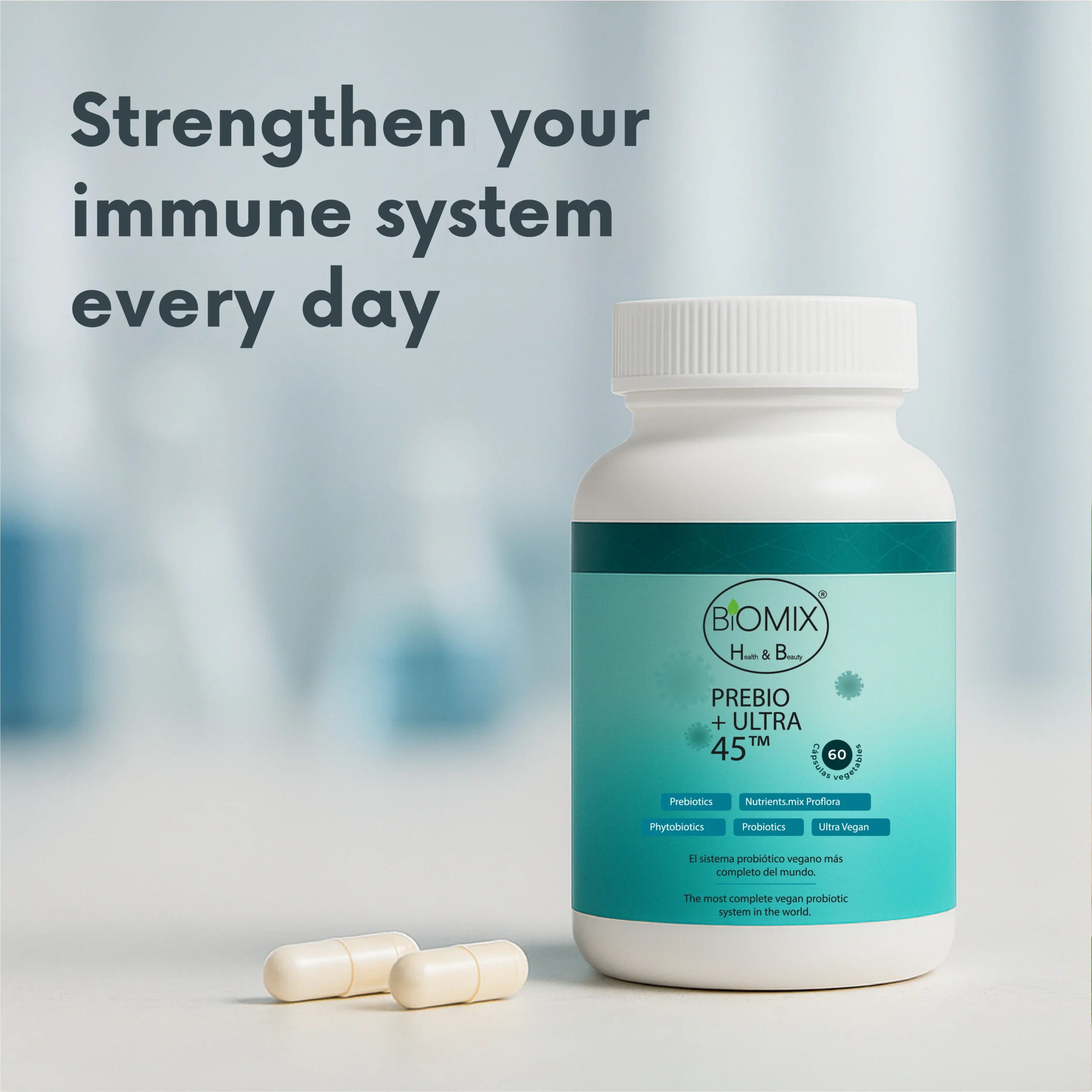 PREBIO+ ULTRA 45™ de Biomix Health & Beauty es una fórmula premium diseñada para brindar un soporte integral a la salud digestiva, inmunológica y metabólica. Combina probióticos clínicos, prebióticos de origen vegetal, fitobióticos antiinflamatorios y micronutrientes esenciales, todo en una cápsula vegetal DRcaps® de liberación retardada.