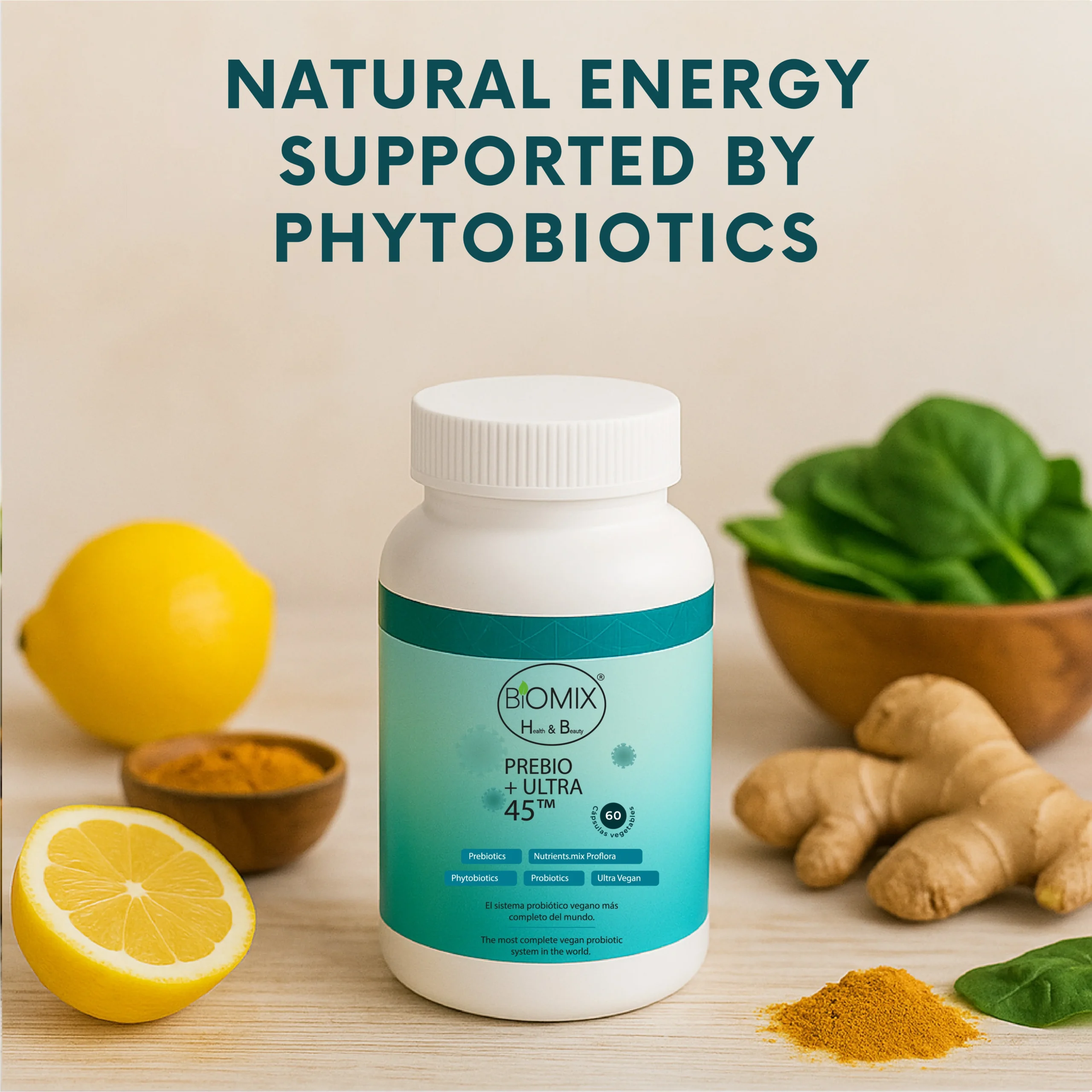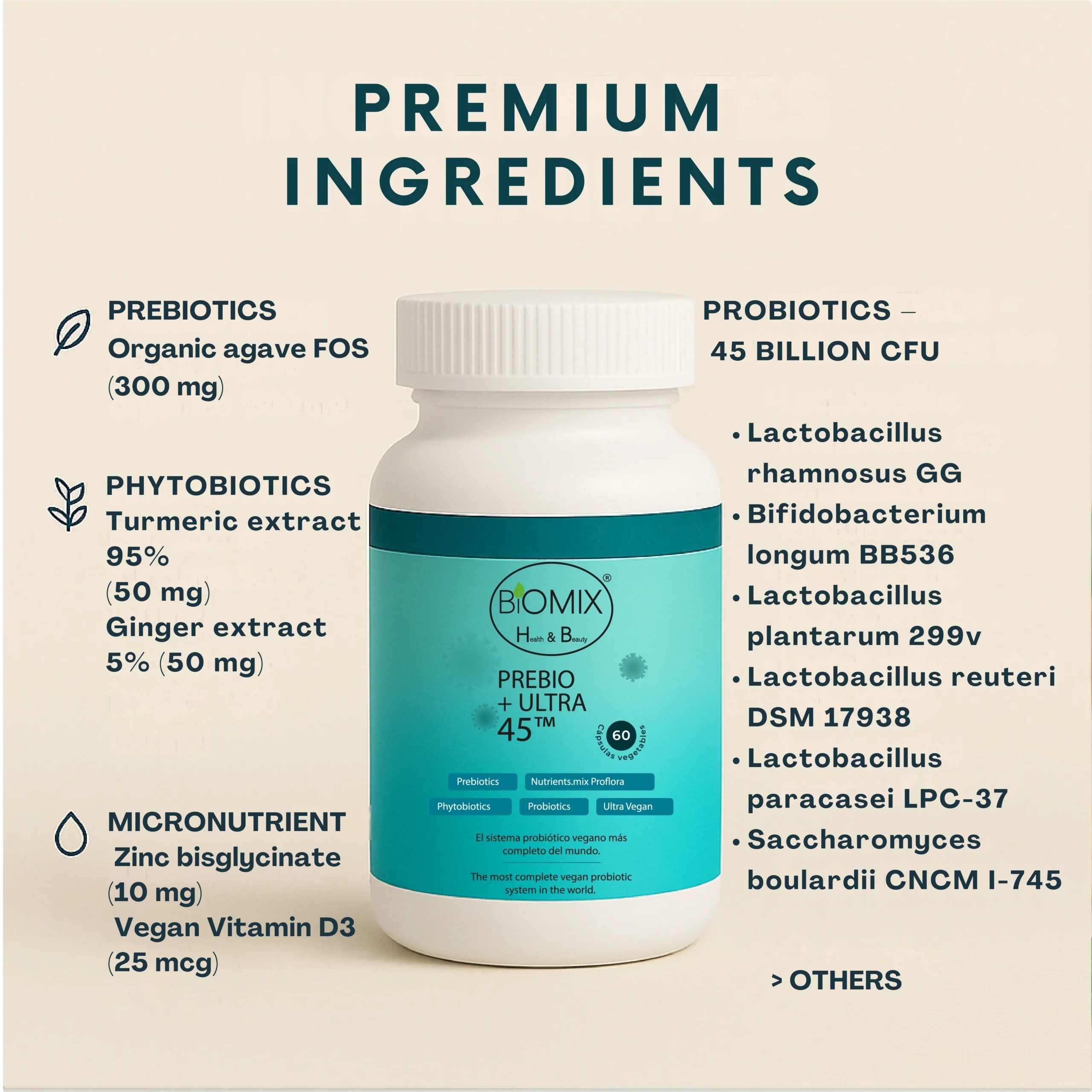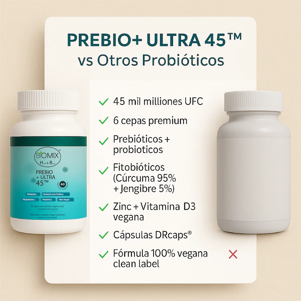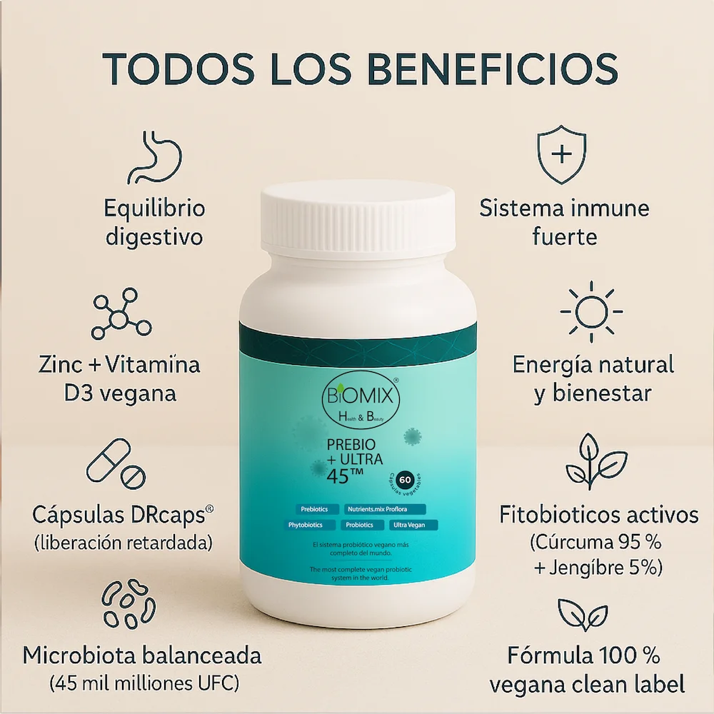 PREBIO+ ULTRA 45™ de Biomix Health & Beauty es una fórmula premium diseñada para brindar un soporte integral a la salud digestiva, inmunológica y metabólica. Combina probióticos clínicos, prebióticos de origen vegetal, fitobióticos antiinflamatorios y micronutrientes esenciales, todo en una cápsula vegetal DRcaps® de liberación retardada.