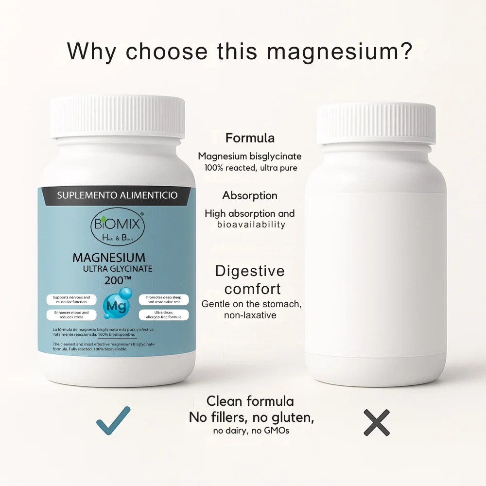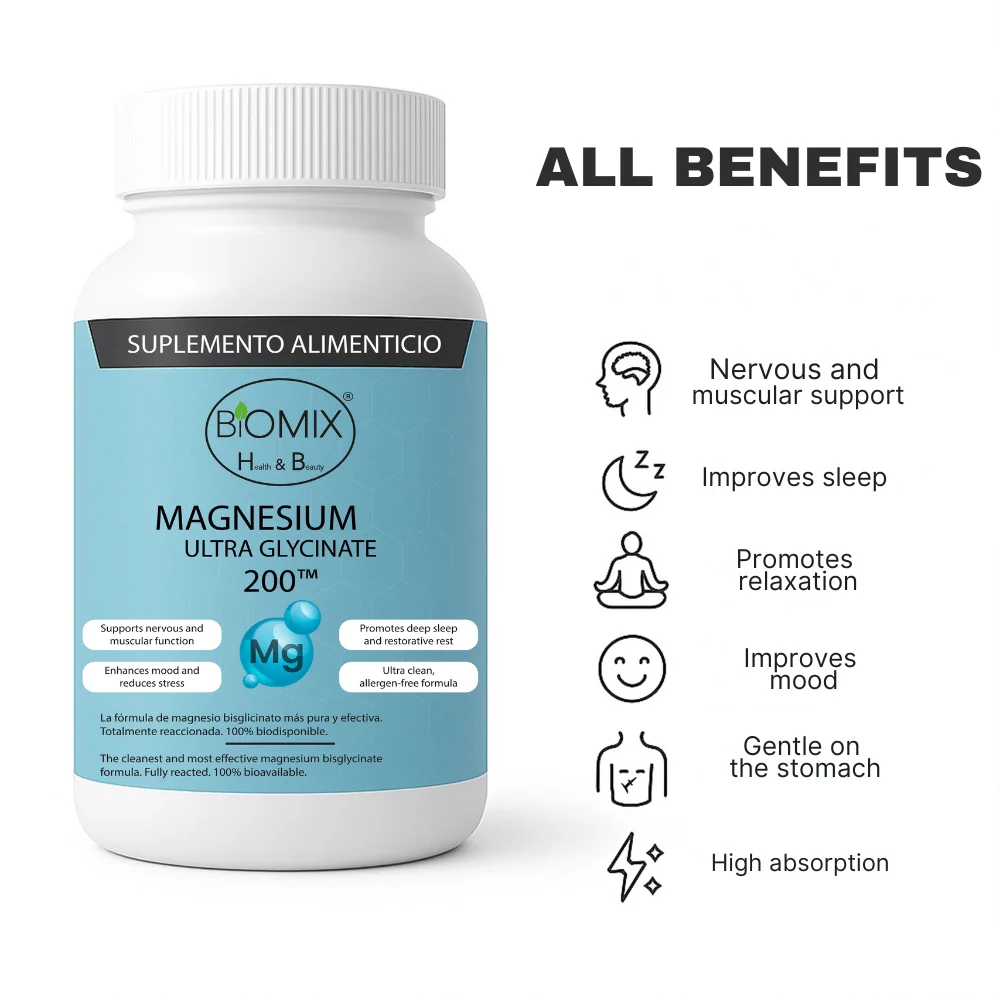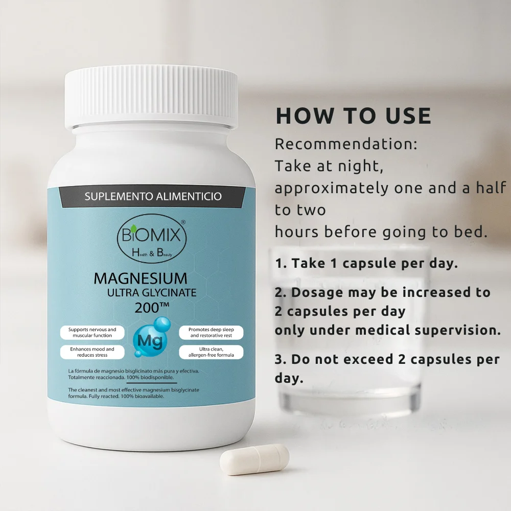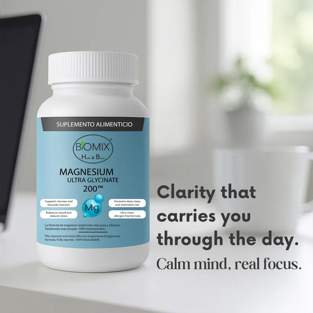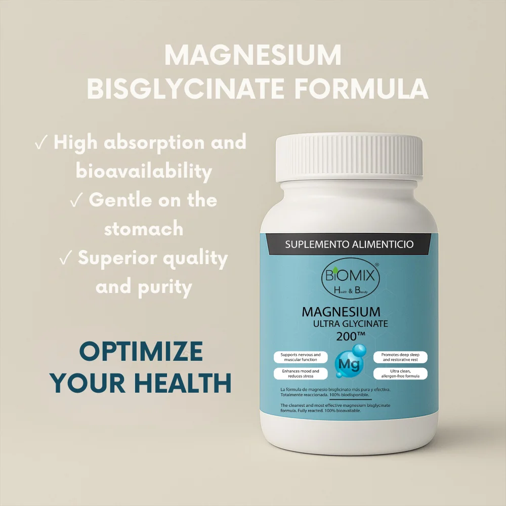 Magnesium Ultra Glycinate 200™ de Biomix Health & Beauty está formulado con magnesio bisglicinato totalmente reaccionado, una de las formas más avanzadas y mejor absorbidas de magnesio. Se absorbe de manera eficiente, es suave con el estómago y no genera molestias digestivas.