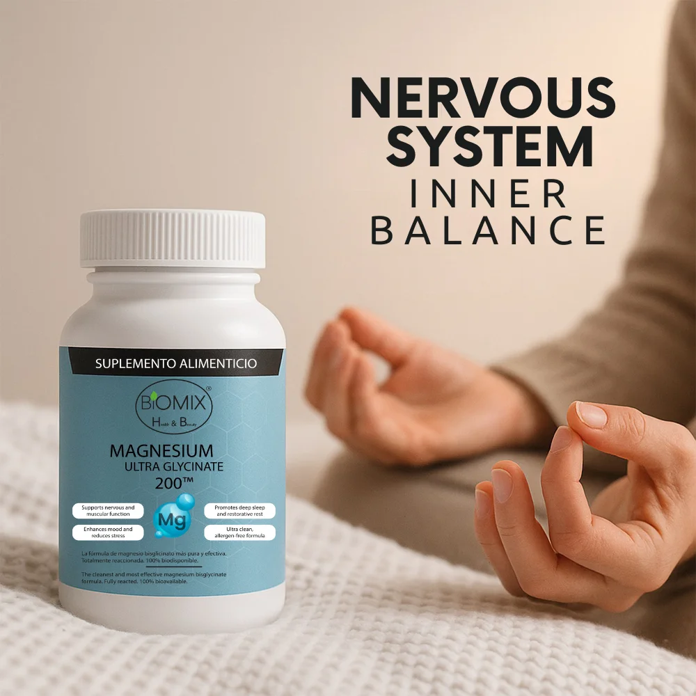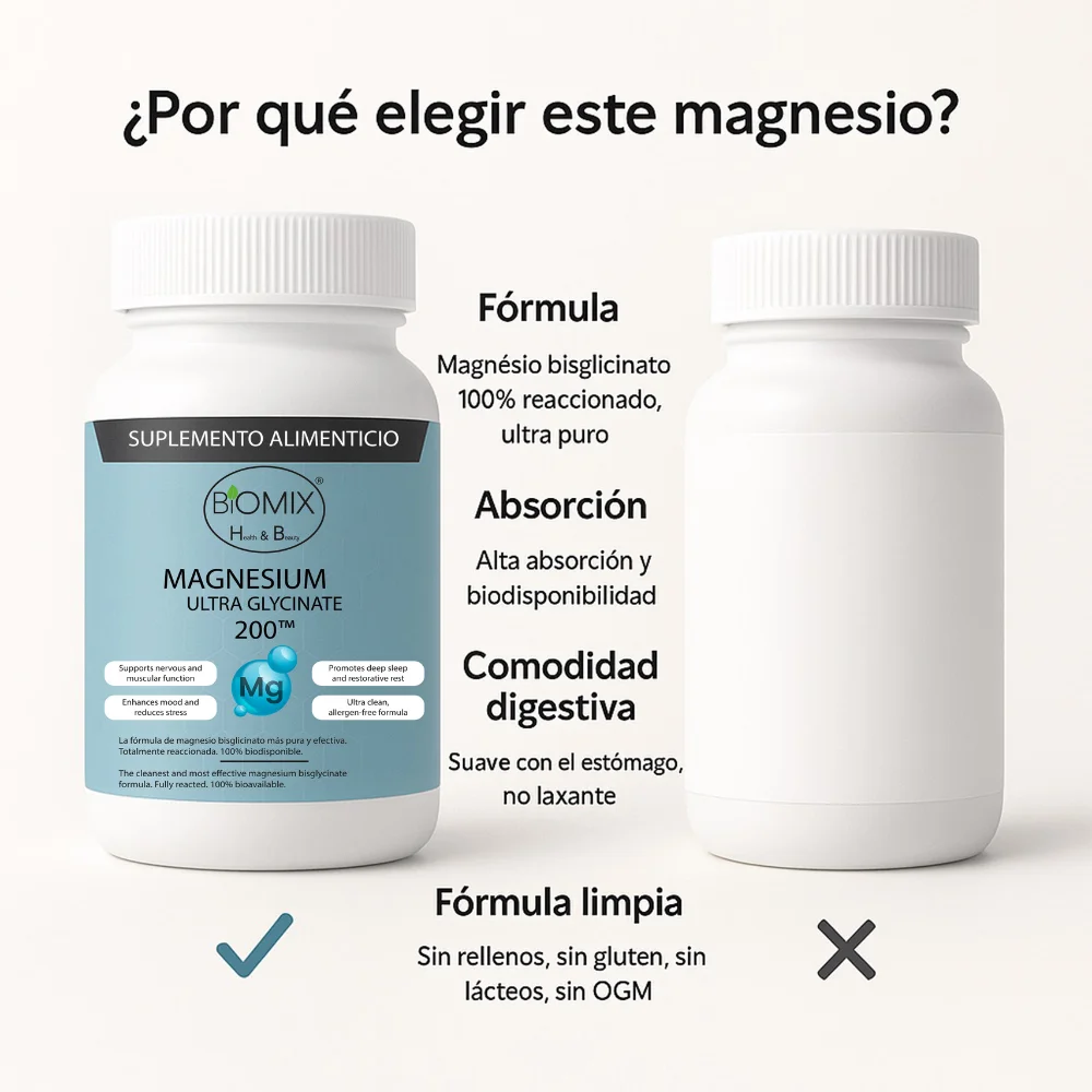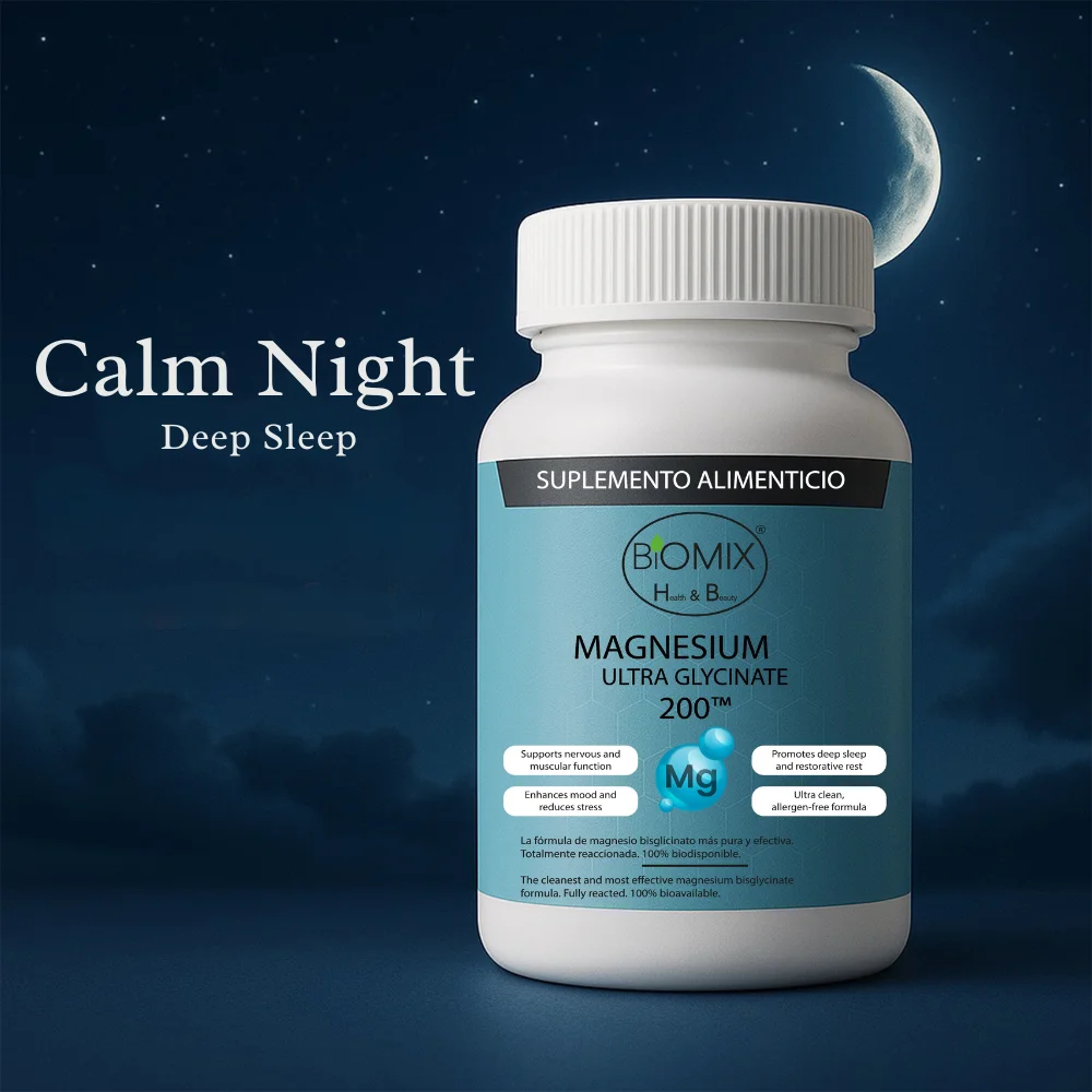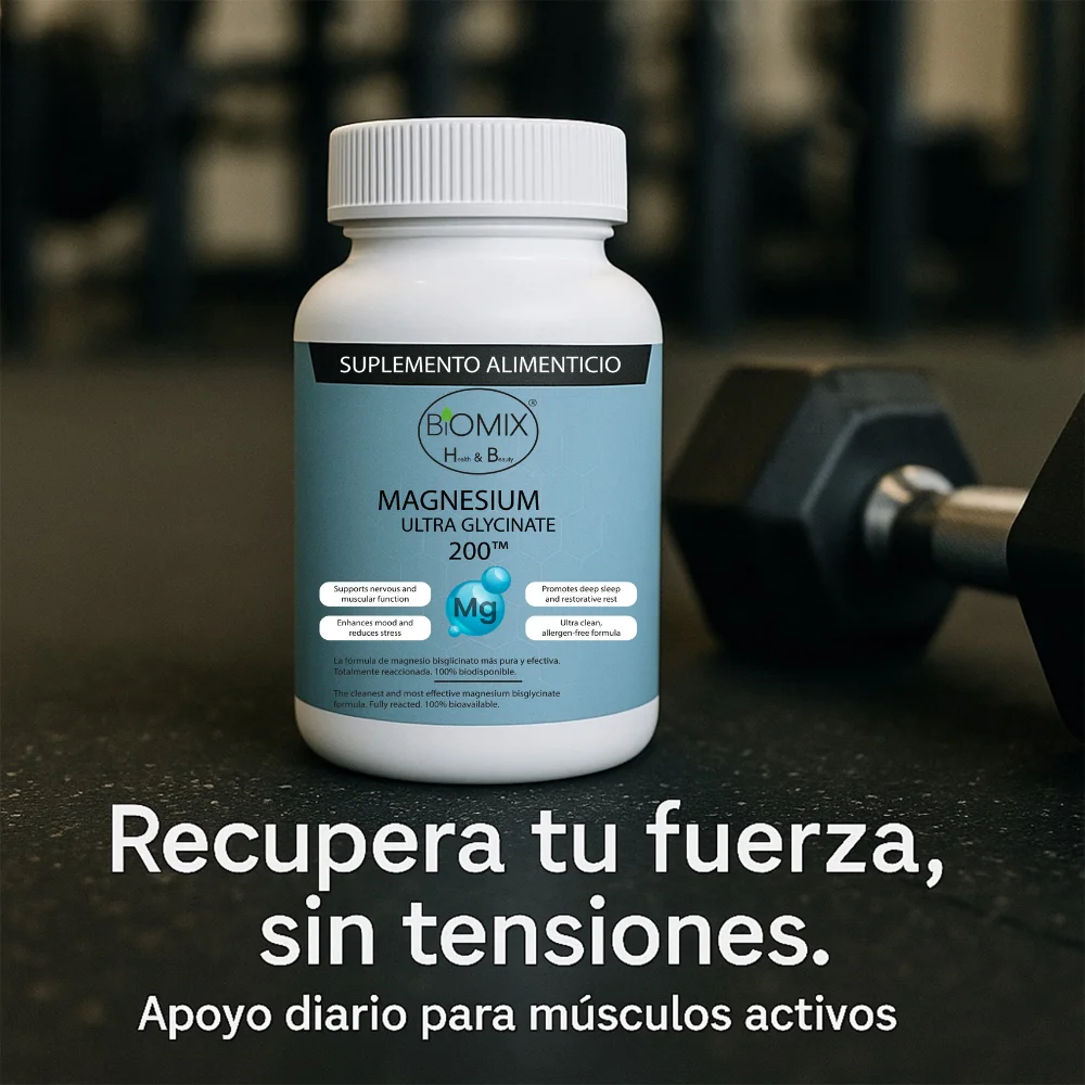 Magnesium Ultra Glycinate 200™ de Biomix Health & Beauty está formulado con magnesio bisglicinato totalmente reaccionado, una de las formas más avanzadas y mejor absorbidas de magnesio. Se absorbe de manera eficiente, es suave con el estómago y no genera molestias digestivas.