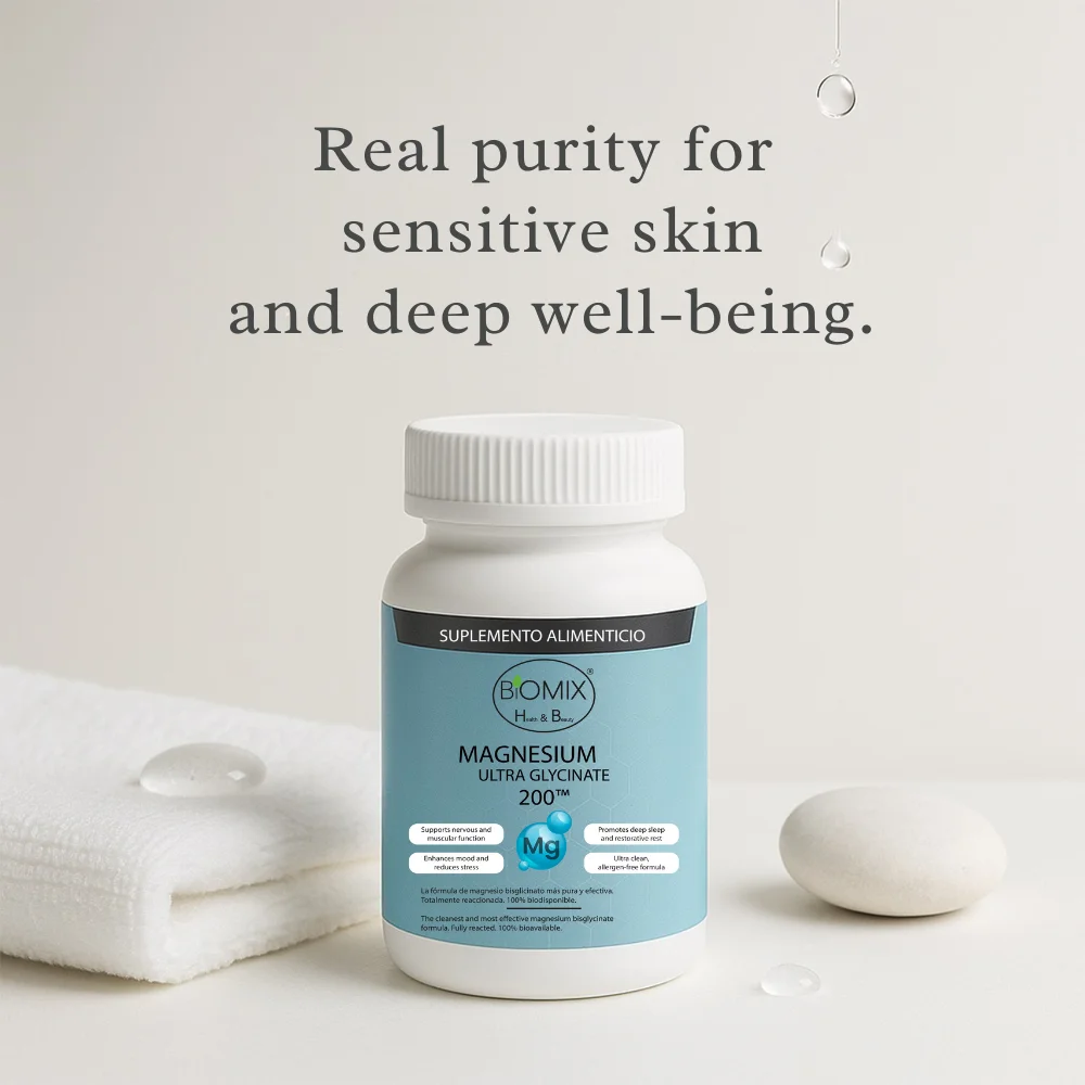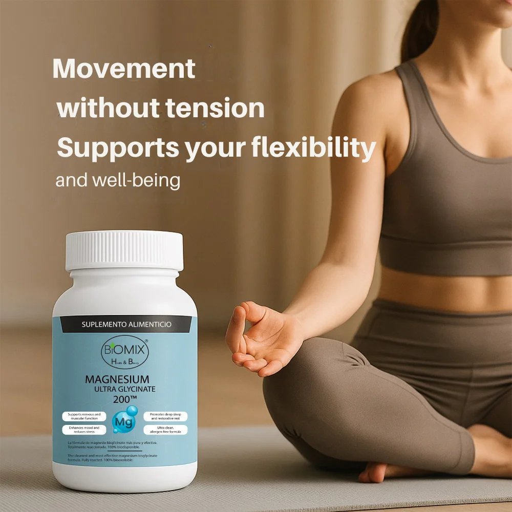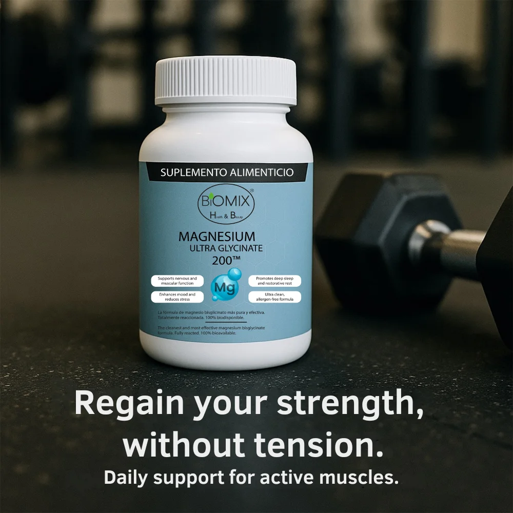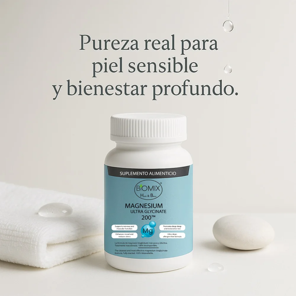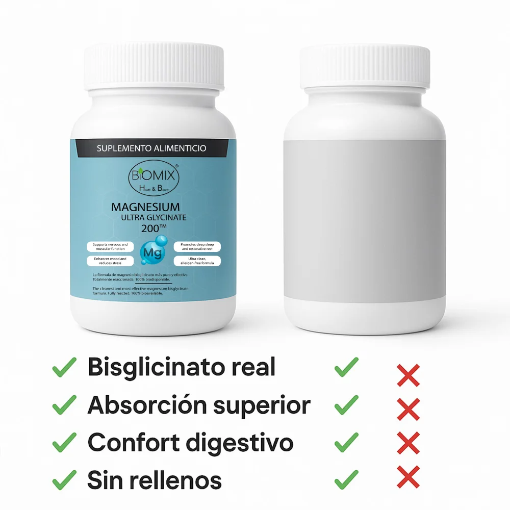 Magnesium Ultra Glycinate 200™ de Biomix Health & Beauty está formulado con magnesio bisglicinato totalmente reaccionado, una de las formas más avanzadas y mejor absorbidas de magnesio. Se absorbe de manera eficiente, es suave con el estómago y no genera molestias digestivas.